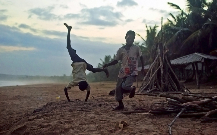 Children play on the beach at the Green Turtle Lodge Saturday, August 11 near Dixcove, Western Region, Ghana. The children come from nearby villages and work all day climbing coconut trees, splitting them with machetes and selling the product to tourists.