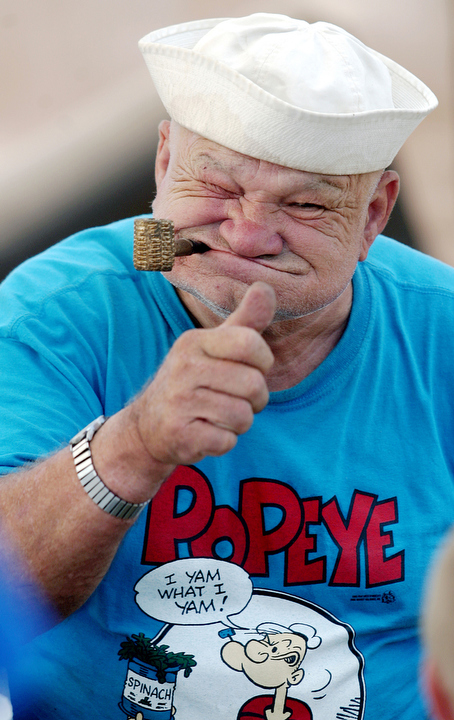 “I want to be ‘Popeye The Good News Man’,” said Denne Kornechuk of St. Anne, Quebec, Canada in a booming voice while handing out booklets and hugs to children Saturday, September 11, at the Popeye Picnic in Chester, Ill. A burly ex-Navy sailer, Kornechuk is the spitting image of the popular comic strip and animated character Popeye. “I looked in the mirror one day and said, I think I see a character there,” said Kornechuk, wrapping his mouth around a corncob pipe and striking a pose to prove his point. The Popeye Picnic is an annual tradition in the small river town of Chester, Ill., which was home to the comic’s creator, E.C. Segar. Each of the characters in the series are based on citizens who lived in Chester during the 1920’s. Kornechuk and hundreds of other faithful Popeye fans make a pilgrimage each year from around the country and around the world to Chester to celebrate their favorite comic strip hero.