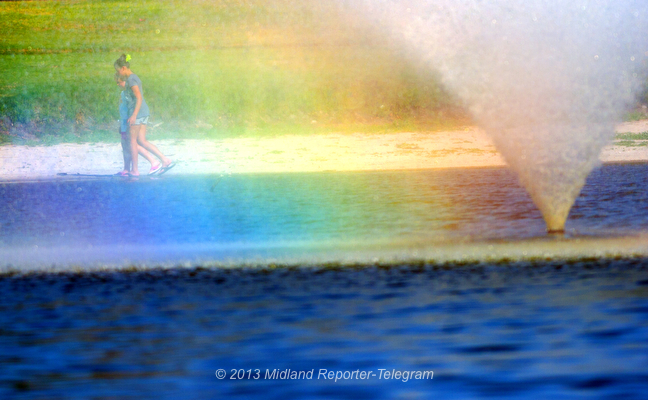 BEST OF 2013 – DURBIN Published January 16, 2014 at 648 × 400 in Best of 2013 Mist from a fountain creates a rainbow as park-goers walk around the pond in Wadley Barren Park June 21, 2013. James Durbin/Reporter-Telegram