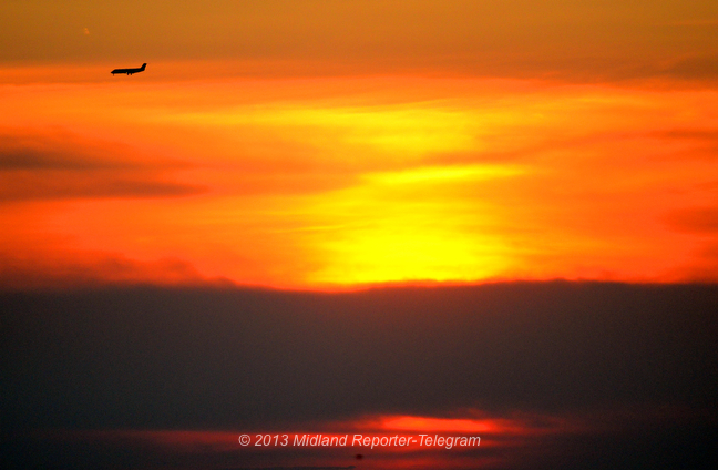 A passenger aircraft rolls into its final approach to Midland International Airport against the setting sun Friday.