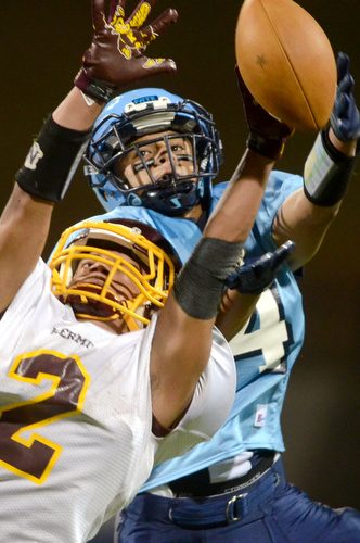 Greenwood’s Ruben Rocha tries to make a reception while Kermit’s Xavier Quiroz tries to break up the pass Thursday at Grande Communications Stadium.