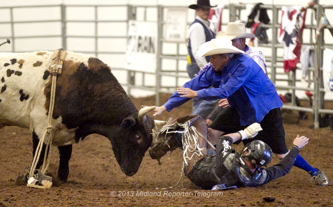 BEST OF 2013 – DURBIN Published January 16, 2014 at 648 × 403 in Best of 2013 Adam Schultz keeps the bull “Wild One” away from bull rider Michael Brown during the Professional Armed Forces Rodeo Association event at Horseshoe Arena on Saturday. James Durbin/Reporter-Telegram