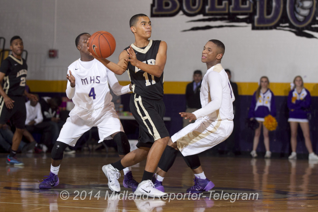 1/4 HS BOYS BBALL: MHS-ABILENE Published February 5, 2014 at 648 × 432 in 2/5 Strobing high school basketball Midland High’s A.D. Johnson (4) and Shawn Rivers (1) cover Abilene High’s Avery Griffith (11) on Tuesday at Midland High. James Durbin/Reporter-Telegram