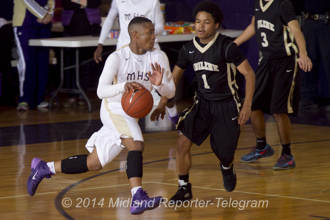 1/4 HS BOYS BBALL: MHS-ABILENE Published February 5, 2014 at 648 × 432 in 2/5 Strobing high school basketball Midland High’s Shawn Rivers (1) dribbles against Abilene High’s Calvin McGee (1) on Tuesday at Midland High. James Durbin/Reporter-Telegram