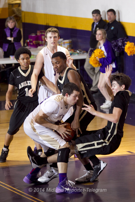 1/4 HS BOYS BBALL: MHS-ABILENE Published February 5, 2014 at 432 × 648 in 2/5 Strobing high school basketball Midland High’s Justin LeClear (00) gets caught up by the Abilene High defense on Tuesday at Midland High. James Durbin/Reporter-Telegram