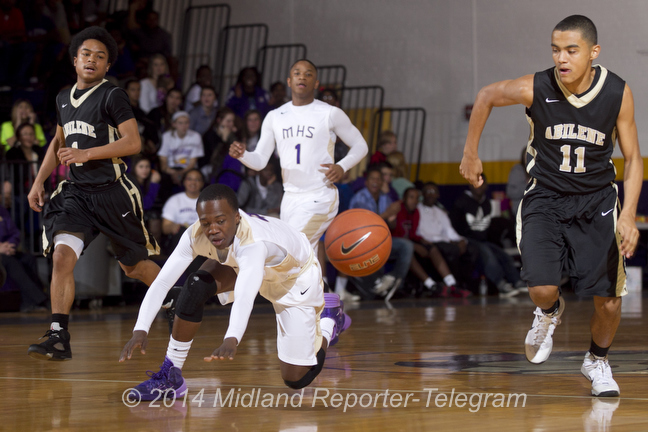 1/4 HS BOYS BBALL: MHS-ABILENE Published February 5, 2014 at 648 × 432 in 2/5 Strobing high school basketball Midland High’s A.D. Johnson (4) goes down while chasing the ball away from Abilene High’s Avery Griffith (11) on Tuesday at Midland High. James Durbin/Reporter-Telegram