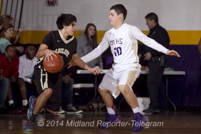1/4 HS BOYS BBALL: MHS-ABILENE Published February 5, 2014 at 648 × 432 in 2/5 Strobing high school basketball Midland High’s Brandon Sanchez (10) covers Abilene High’s Chris Castel (3) on Tuesday at Midland High. James Durbin/Reporter-Telegram