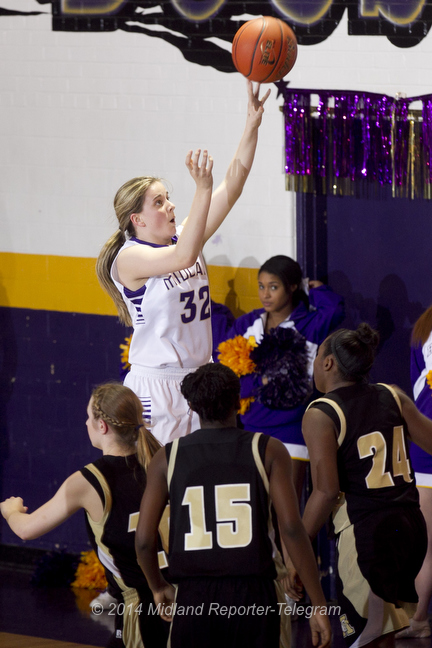 1/4 HS GIRLS BBALL: MHS-ABILENE Published February 5, 2014 at 432 × 648 in 2/5 Strobing high school basketball Midland High’s Claire Lancaster (32) goes up for a shot over the Abilene High defense on Tuesday at Midland High. James Durbin/Reporter-Telegram