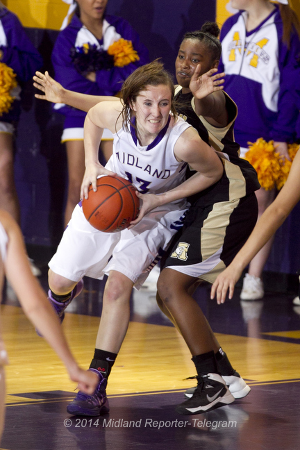 1/4 HS GIRLS BBALL: MHS-ABILENE Published February 5, 2014 at 432 × 648 in 2/5 Strobing high school basketball Midland High’s Aubrie Elliott (13) drives to the hoop against Abilene High’s Shannon Garrett (24) on Tuesday at Midland High. James Durbin/Reporter-Telegram