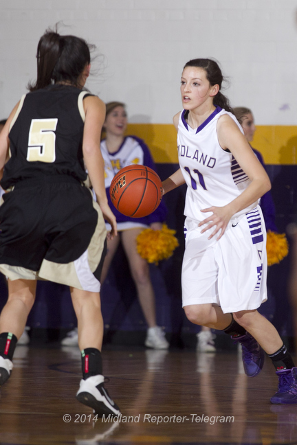 1/4 HS GIRLS BBALL: MHS-ABILENE Published February 5, 2014 at 432 × 648 in 2/5 Strobing high school basketball Midland High’s Miranda Mast (11) dribbles against Abilene High’s Jaime Flores (5) on Tuesday at Midland High. James Durbin/Reporter-Telegram