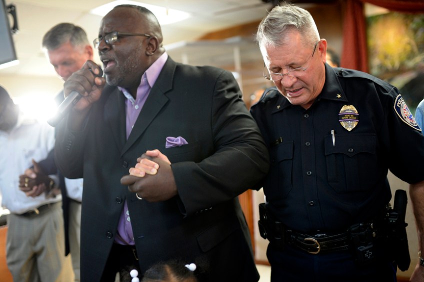 Pastor Tommie Hale prays while holding hands with Midland Police Department Deputy Chief Jeff Darr during a prayer service for love and peace Wednesday, July 13, 2016, at Mount Calvary Missionary Baptist as the nation mourns the deaths of citizens in police custody and five Dallas law enforcement officers killed in a retaliatory attack.