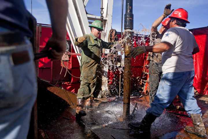 (PHOTO TO BE PAIRED WITH OIL AND GAS / ECONOMY NEWS STORIES) Guy Cummings (left), Carl Merworth (center, rear) and Desiderio Castillo (right) attach a 90-foot section of pipe onto the end of an active drill pipe on the drilling floor of Robinson Drilling rig #4 on Wednesday, Feb. 17, 2016, in Midland County.