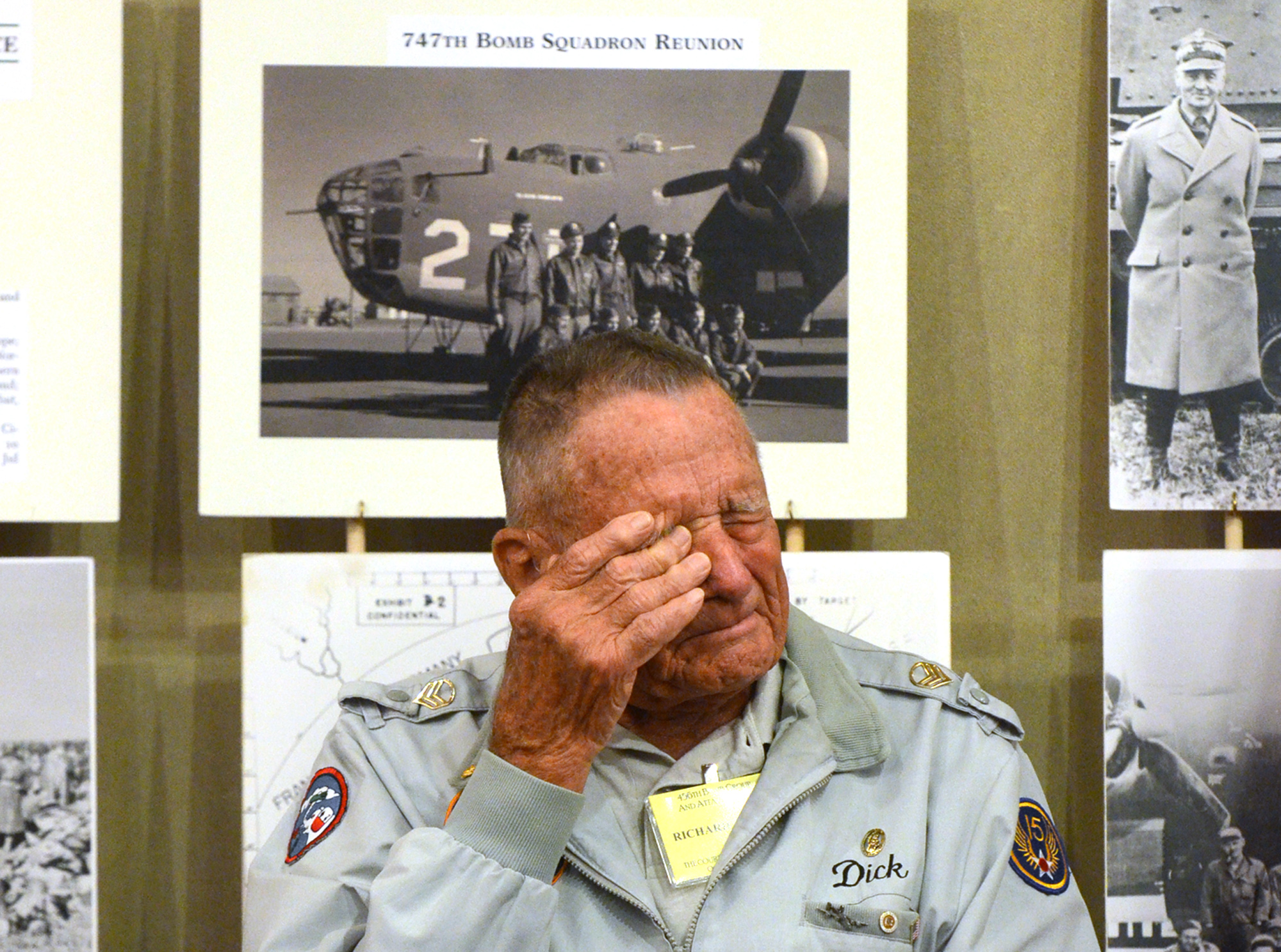 Richard Fields, gunner aboard a B-24 during World War II, pauses to collect his thoughts while speaking about friends who were killed in action at a press conference Thursday in the hospitality room of the Marriott Courtyard hotel.