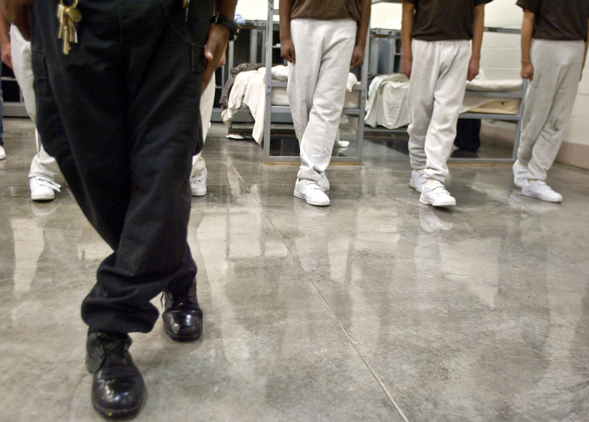 An officer at the Illinois Youth Center in Murphysboro, Ill. demonstrates to new detainees the proper way to perform an “about face,” or 180 degree counterclockwise turn, in a detention dorm, Oct. 2, 2009.