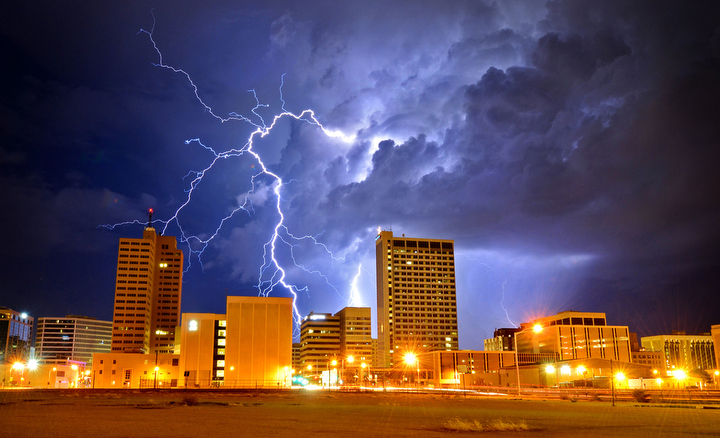 Lightning strikes Sept. 12, 2011 over downtown Midland. The National Weather Service reported 0.18 inches of rain had fallen in Midland by Thursday morning. The possibility for thunderstorms will continue through the weekend.