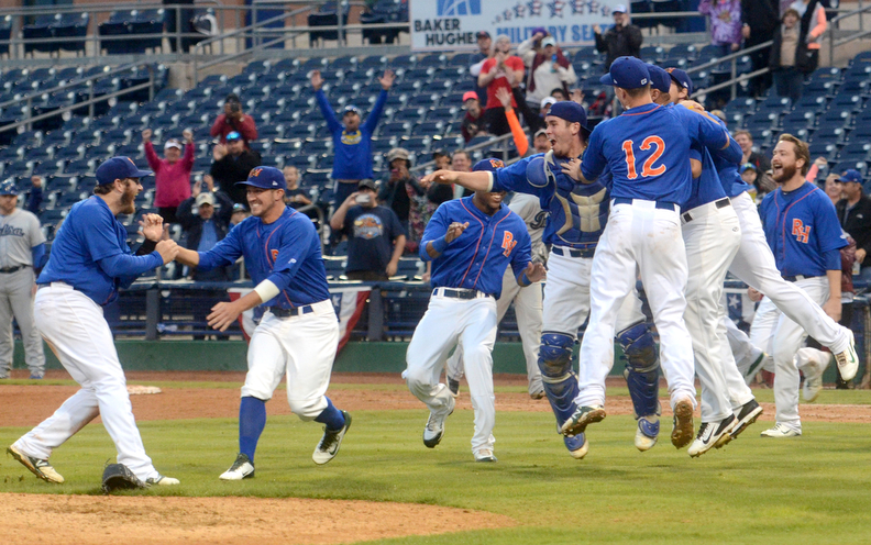 Rockhounds celebrate a 5-0 win over Tulsa in the final game of the Texas League Championship series Sept. 14, 2014 at Security Bank Ballpark in Midland.
