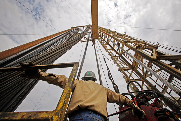 (PHOTO TO BE PAIRED WITH OIL AND GAS / ECONOMY NEWS STORIES) Members of a wireline crew perform wellsite service on a rig located near Highway 385 south of Odessa, Sept. 24, 2014.