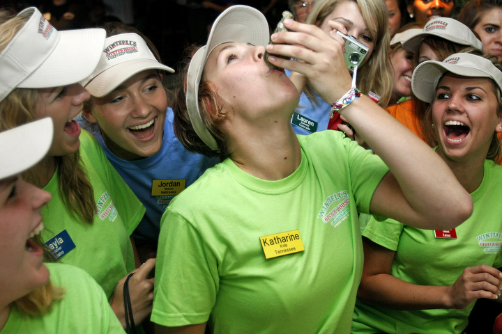 America’s Junior Miss scholarship contestants look on as Tennessee’s Junior Miss Katharine Kolp downs a raw oyster at Wintzell’s Oyster House in downtown Mobile, Al., June 22, 2009. An award was given to the scholarship pageant contestant who could eat the most oysters in one sitting.