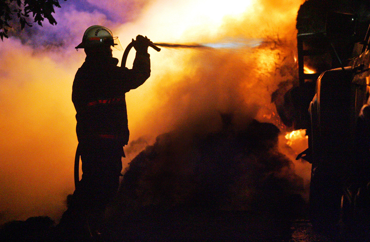 Ashley Loudermilk, Assistant Fire Chief of Hazen Fire & Rescue, battles a vehicle fire that shut down the westbound lanes of Interstate 40 near Hazen, Ark., Oct. 20, 2011. Dennis and Francis Hixson of Princeton, Texas (not pictured) were hauling a trailer full of hay behind their pickup truck when they experienced a tire blowout around 7 p.m., sending sparks from the rim into the trailer and starting a fire. The Hixsons own a land and cattle company and were forced to travel hundreds of miles for hay due to a drought in Texas. “[Francis] was just saying this was our worst year yet and I told her we had been through worse,” said Dennis Hixson, “and then the trailer caught on fire.”