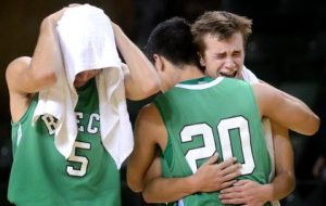 - Breckenridge’s Mykal Abila (20) and Cam Toombs (middle) embrace while teammates Anthony Ramirez (5) and Alfredo Alvarado (42) react to a loss against Childress on Friday, March 6, 2015 at Chaparral Center. James Durbin/Reporter-Telegram