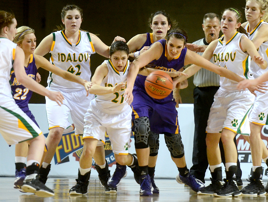 Idalou’s Courtney Hurst (21) fights against Merkel’s Tiffany Young to snag a loose ball during the UIL Region 1-AA Girls Basketball Semi-Final game Feb. 22, 2013 at Chaparral Center in Midland.