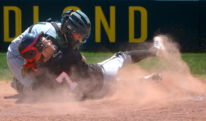 Midland College catcher Amy Anderson tags out Howard College’s Rebecca Long at home plate Friday at the Midland College softball field.