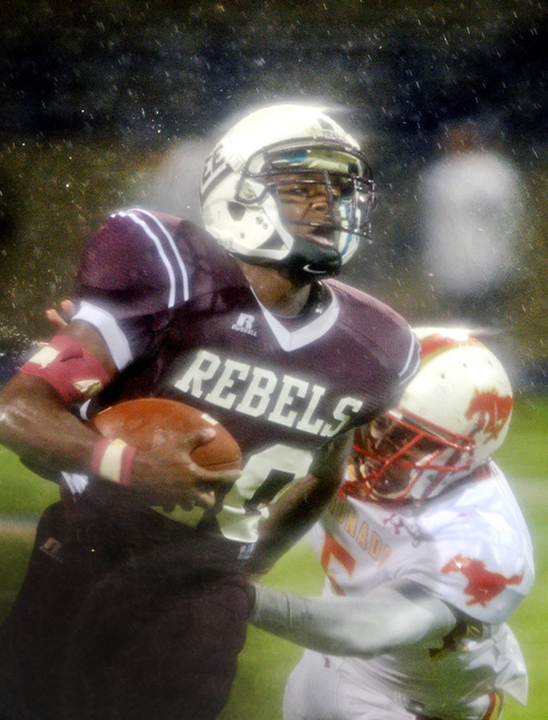 Midland Lee running back Jason McAfee shakes off a tackle from Lubbock Coronado defensive back Shed Kelly to score a touchdown during the first half of play Friday at Grande Communications Stadium.
