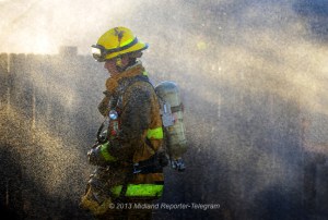 - A Midland firefighter walks through the mist from a fire hose after a blaze destroyed a trailer home near the intersection of West County Road 137 and Rankin Highway Jan. 30, 2013. James Durbin/Reporter-Telegram