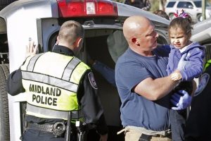 - A Midland firefighter carries a girl away from a rolled Chevrolet Tahoe that was involved in a collision with a Midland Police vehicle Tuesday, November 13 at the intersection of Colorado St. and Ohio St. All parties involved were wearing seat belts and no were fatalities reported.