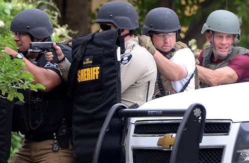 Members of the Midland County Sheriff’s Department SWAT team approach a residence where they suspect an armed individual was barricaded on Thursday, April 23, 2015, near the intersection of Brunson Ave. and Baldwin Street in downtown Midland, Texas.