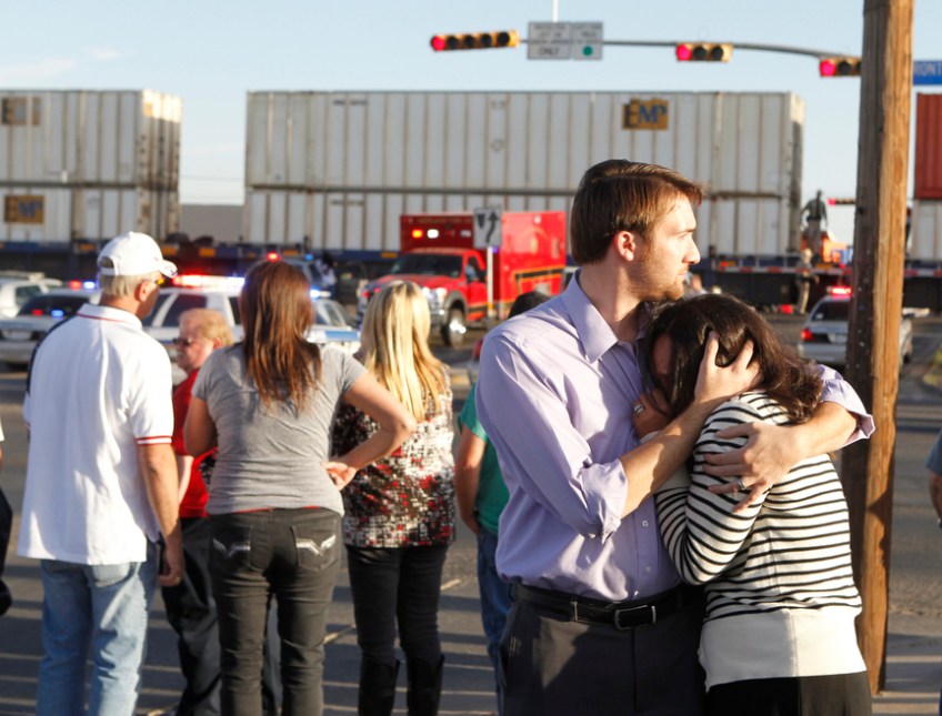 Bystanders react after a flatbed truck carrying wounded veterans and their families was struck by a train during a parade honoring wounded veterans Thursday, November 15 in Midland, Texas. Four veterans died and 14 other people were injured in the accident, which is under investigation by the NTSB.